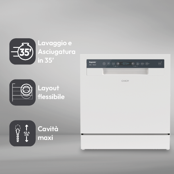 Ecco Candy Rapido', una lavastoviglie da tavolo compatta che fornisce la soluzione perfetta se hai difficoltà a caricare una lavastoviglie di grandi dimensioni. Le sue dimensioni ridotte si adattano perfettamente agli spazi più piccoli della cucina ed è stato migliorato per essere più efficiente e intelligente, vantando una serie di cicli rapidi e funzionalità volte a semplificare la vita quotidiana.